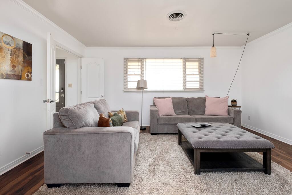 The home has two bedrooms with full queen beds. The third bedroom has a full-size bed with a trundle pullout bed. There are two living rooms with smart televisions. You are free to sign in to your account for each application. Please remember to sign out of your accounts before you leave, if you don't mind. The living rooms are large enough to put an air-up mattress on the floor for an extra guest. The garage can hold two cars and park cars or small trailers. It is also an excellent way to protect your vehicle in bad weather. The basement is for severe weather only. There is nothing else down there, and it is not designed for living. If you wish to sit outside, there will be cushions inside the little shed outside for seating. There is also a BBQ grill in the shed for use. It is a propane grill.