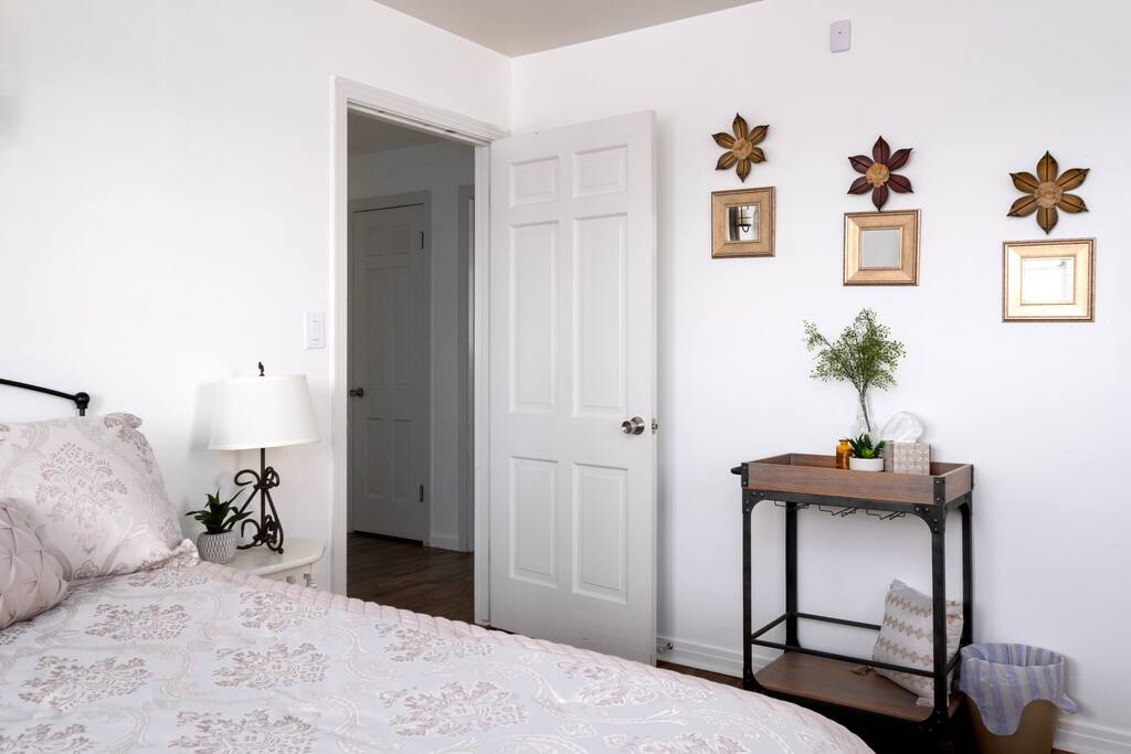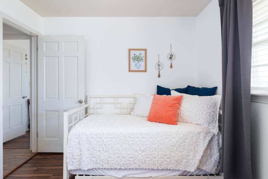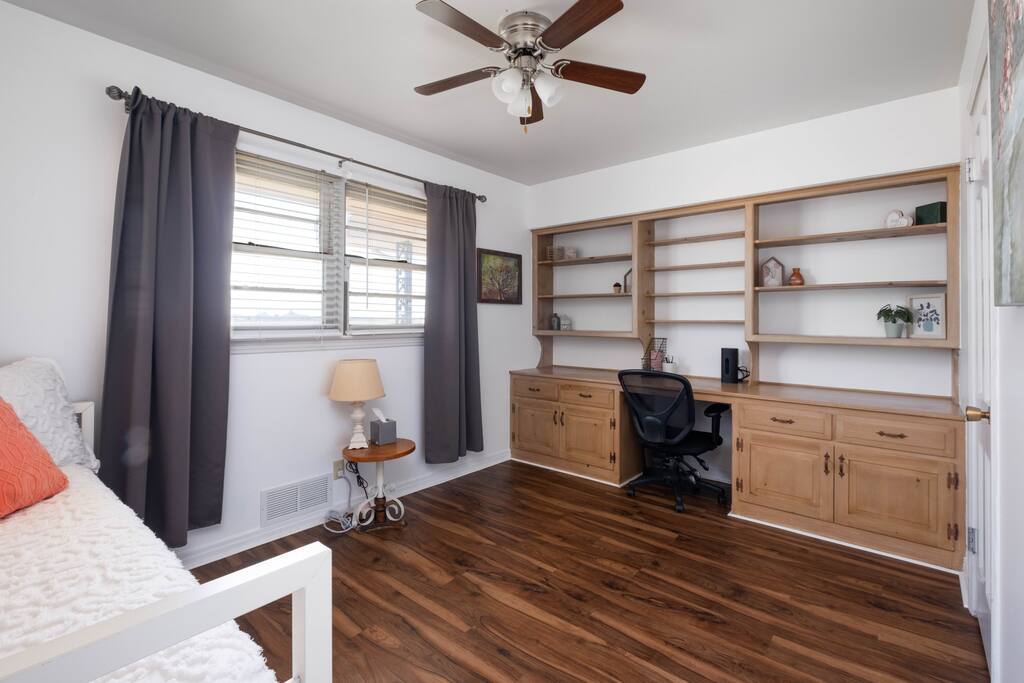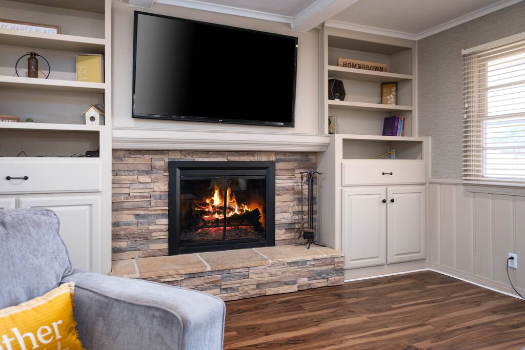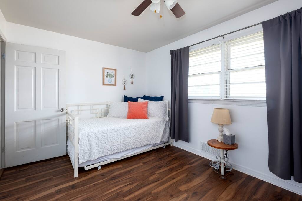The home has two bedrooms with full queen beds. The third bedroom has a full-size bed with a trundle pullout bed. There are two living rooms with smart televisions. You are free to sign in to your account for each application. Please remember to sign out of your accounts before you leave, if you don't mind. The living rooms are large enough to put an air-up mattress on the floor for an extra guest. The garage can hold two cars and park cars or small trailers. It is also an excellent way to protect your vehicle in bad weather. The basement is for severe weather only. There is nothing else down there, and it is not designed for living. If you wish to sit outside, there will be cushions inside the little shed outside for seating. There is also a BBQ grill in the shed for use. It is a propane grill.